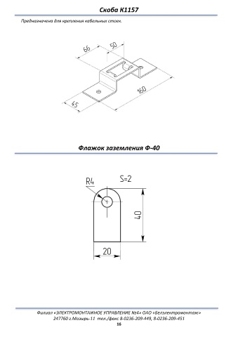 Скоба К1157 Предназначена для крепления кабельных стоек. Флажок заземления Ф-40 Филиал «ЭЛЕКТРОМОНТАЖНОЕ УПРАВЛЕНИЕ №4» ОАО «Белэлектромонтаж» 247760 г.Мозырь-11 тел./факс 8-0236-209-449, 8-0236-209-451 16