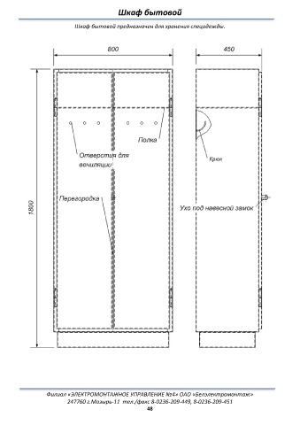 Шкаф бытовой Шкаф бытовой предназначен для хранения спецодежды. Филиал «ЭЛЕКТРОМОНТАЖНОЕ УПРАВЛЕНИЕ №4» ОАО «Белэлектромонтаж» 247760 г.Мозырь-11 тел./факс 8-0236-209-449, 8-0236-209-451 48