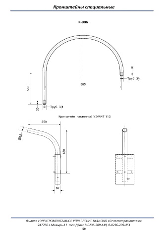 Кронштейны специальные К-986 30 Труб. 3/4 585 560 Труб. 3/4 30 Кронштейн настенный УЭМИТ 113 350 Ø48 630 60 Филиал «ЭЛЕКТРОМОНТАЖНОЕ УПРАВЛЕНИЕ №4» ОАО «Белэлектромонтаж» 247760 г.Мозырь-11 тел./факс 8-0236-209-449, 8-0236-209-451 50