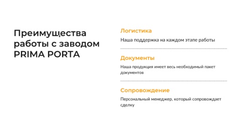 Преимущества Логистика работы с заводом Наша поддержка на каждом этапе работы PRIMA PORTA Документы Наша продукция имеет весь необходимый пакет документов Сопровождение Персональный менеджер, который сопровождает сделку