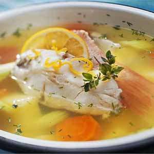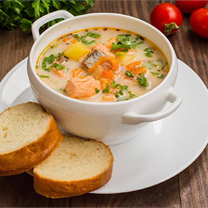Русская уха из трёх видов рыбы с копчёной сметаной и ржаными гренками