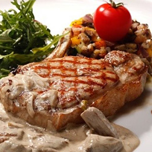 Стейк из свиной шеи и овощи на гриле с обжигом